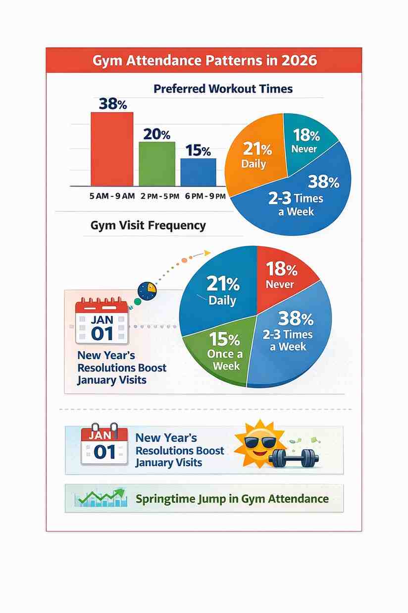 Gym attendance patterns are expected to change in 2026, with members attending gyms based on personalized schedules and seasonal goals. According to recent surveys, a significant percentage of gym members in the U.S. prefer early morning gym sessions (5 am–9 am), making this the peak time for attendance. However, gyms are becoming more accommodating for non-traditional hours, as flexible gym memberships allow people to work out when it suits them best (Source).