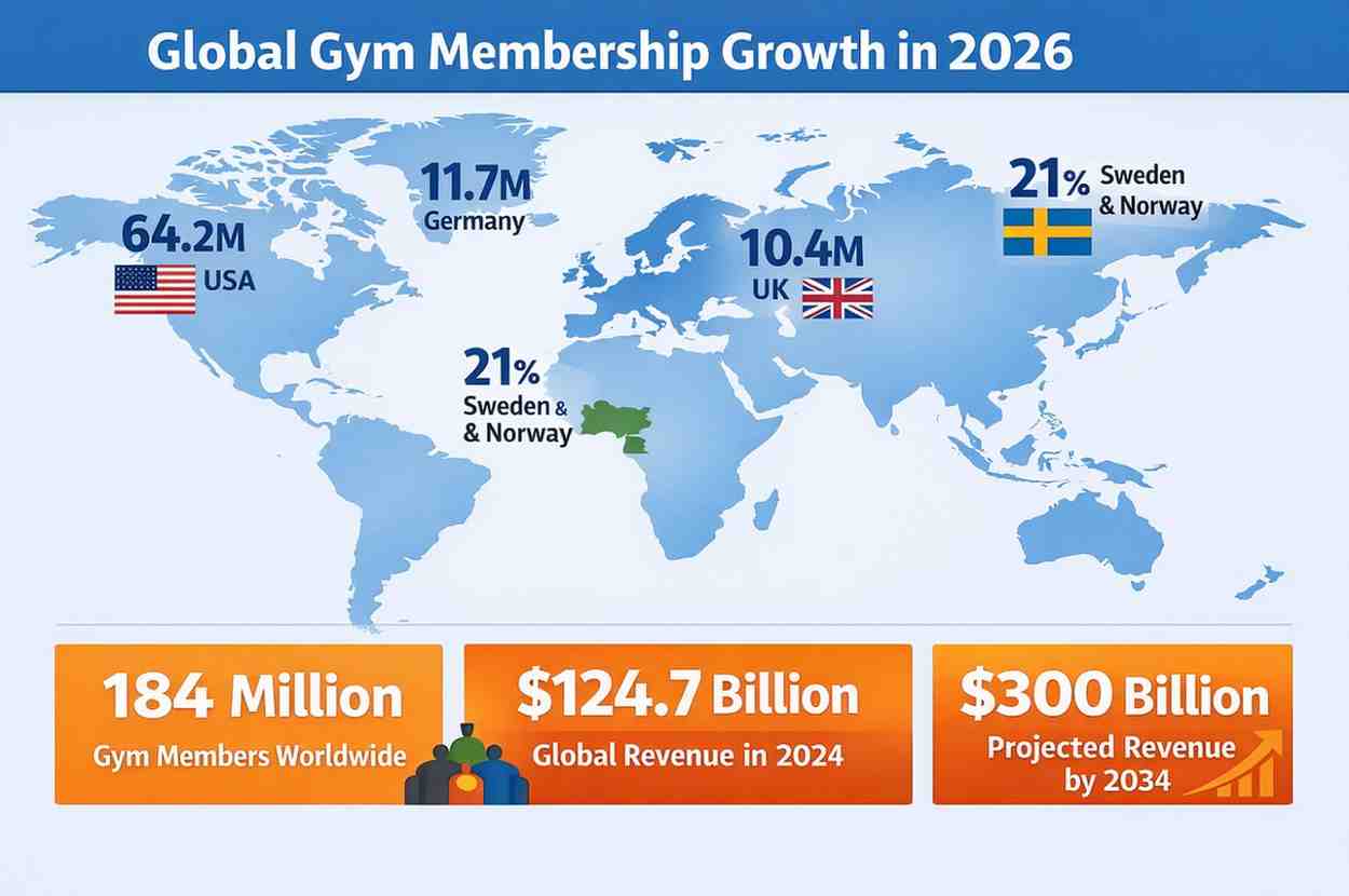 Gym membership growth around the world is uneven but accelerating. Western countries like Sweden and the USA have some of the highest membership rates, with over 20% of the population regularly enrolled in fitness clubs (Source).